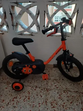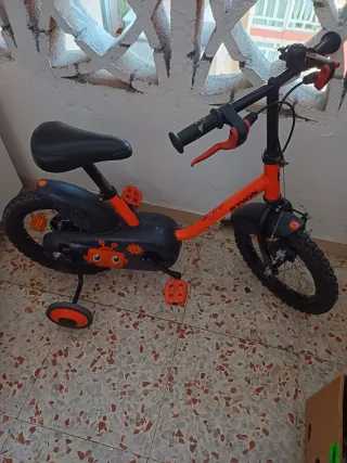 Bicicleta infantil de la marca Btwin, en color naranja. Ruedas de 16 pulgadas. Frenos delantero y trasero. Sillín ajustable en altura. Dispone de ruedines. Está nueva,sólo la usó 1 vez,porque realmente no le gusta la bici al niño,tiene el desgaste que se ve en la foto 4ª de tenerla atada con una cuerda,pero está perfecta. La podéis probar sin compromiso.Costó 140,la dejo en 70€