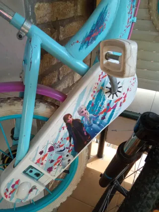 Bicicleta infantil con diseño de Frozen, tamaño de rueda 16 pulgadas. - Cuadro blanco con detalles de los personajes. - Ruedas con llantas y radios en color azul. - Sillín y puños a juego con el diseño. - se ha roto un ruedin