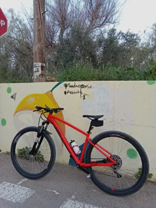 Bicicleta de montaña Rockrider EXPL 500 en color rojo. - Cuadro de aluminio en perfecto estado Talla L - Transmisión monoplato 32T con 8 velocidades - Ruedas de 29 pulgadas tubeless ready (Actualmente con neumáticos Kenda Booster nuevas, se entrega también con otro par de cubiertas en buen estado originales rockrider all mountain 29x2,2) - Frenos de disco 160mm hidráulicos Tektro - Suspensión delantera 100mm