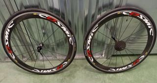 Juego de ruedas Mavic Cosmic SL. - Ruedas de carbono frenada aluminio -ruedas sin cubiertas ni piñon -para cubierta y camara -perfil 55 -para piñon shimano 10/11 v -sin cierres -rueda trasera con refuerzo de arandelas en cabecillas