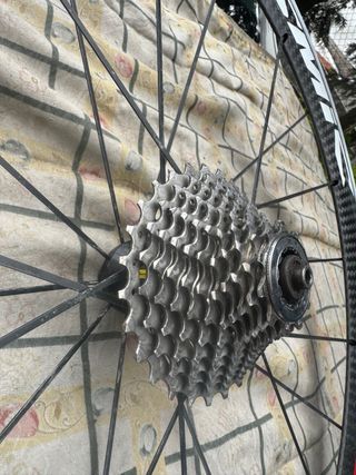 Material: Carbono Tipo: Cubierta Ancho interno: 18mm Perfil: 52mm Nucleo: Shimano HG Ejes: QR 9mm Sistema de Frenado: Zapata Peso (fabricante): 1930kg (aprox) Estado: Usado