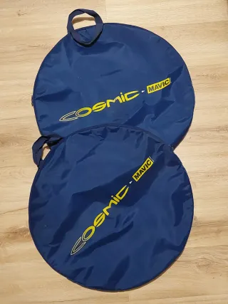Juego de bolsas de transporte para ruedas Mavic Cosmic, años 90, color azul marino. Logo amarillo de Mavic Cosmic vintage. En muy buen estado a excepción de un pequeño desconchón en el logo de Cosmic y la falta de una cremallera del bolsillo interior. Pieza de coleccionista, incluye las instrucciones de montaje del juego de ruedas. Campagnolo Cinelli Zeus NOS Shimano