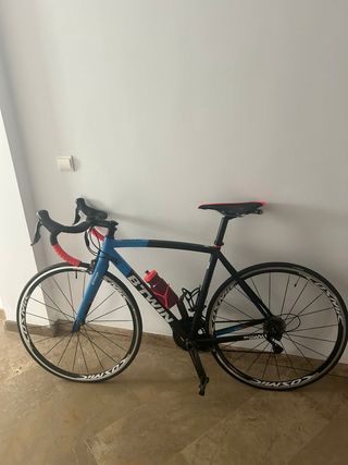 Bicicleta de carretera Btwin con cuadro de aluminio y horquilla de carbono. Ideal para entrenamientos y rutas. - Cuadro de aluminio. - Horquilla de carbono. - Frenos de llanta - Cambio Shimano. - Ruedas Mavic Cosmic. - Portabidón incluido. 📏 Talla S