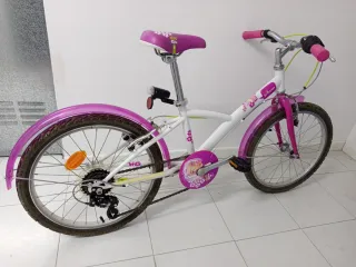 Bicicleta infantil Btwin en color rosa y blanco, ideal para niñas. - Cuadro de acero. - Cambios en la empuñadura - Ruedas de 24 pulgadas. - Frenos V-brake. - Guardabarros delantero y trasero. - Sillín acolchado con diseño. - Puños de goma. - Reflectores en ruedas y pedales. - Pata de cabra - Luz trasera.