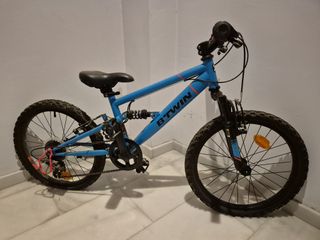 Bicicleta infantil de la marca B'Twin, ideal para niños. - Color azul vibrante. - Ruedas de 20 pulgadas. - Diseño deportivo.