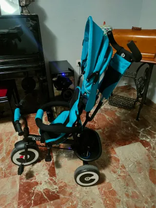Triciclo infantil de color azul turquesa y negro, ideal para los más pequeños. - Asiento acolchado. - Barra de empuje. - Reposapiés. - Ruedas con diseño. -tiene para bloquear los pedales y e puede usar empujando como un cochecito o puede pedalear el niño cuando es un poco más grande. -Cesta para llevar cosas -Timbre Y lo mejor capota para evitar el sol. Como nuevo.