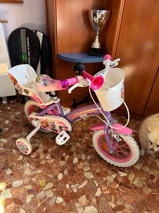 Bicicleta infantil de color rosa, ideal para niños y niñas. Muy cuidada, siempre en interior. - Ruedas de 16 pulgadas. - Diseño divertido con pegatinas. - Sillín y puños a juego.