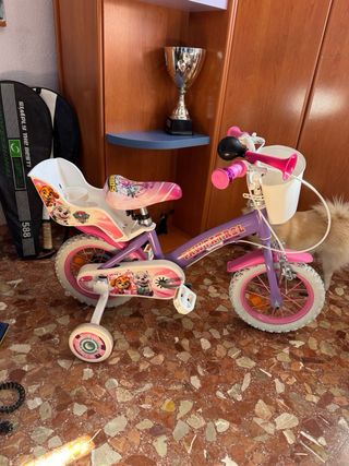 Bicicleta infantil de color rosa, ideal para las primeras aventuras sobre ruedas. Cuenta con un diseño llamativo y ruedas todoterreno. - Cuadro de color rosa. - Sillín blanco con algún desperfecto. - Pedales negros.