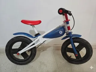 Bicicleta de aprendizaje para niños, de Imaginarium. Ideal para iniciarse en el mundo de las dos ruedas. Con roces pero en buen estado general - Diseño en blanco, azul y rojo. - Ruedas negras. - Sillín rojo. - Guardabarros delantero y trasero. - Con freno y posibilidad de acoplarle pedales de iniciación.