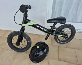 Bicicleta de equilibrio Btwin, con casco, en color negro, ideal para que los más pequeños aprendan a impulsarse y ganar confianza. Por supuesto sillín regulable en altura - Marco de aluminio. - Ruedas de goma con buen agarre. Quiero aclarar que la tengo en Javea.