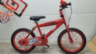 Bicicleta infantil de color rojo con diseño de Extreme Motors en excelente estado. - Ruedas de 16 pulgadas. - Incluye pegatinas decorativas. - Frenos delanteros y traseros. - Soporte lateral de apoyo para facilitar manejo a los niñ@s.
