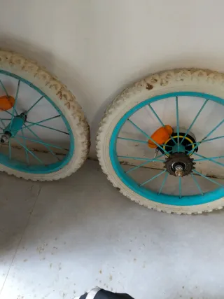 Se venden dos ruedas de bicicleta de 16 pulgadas completas de cubiertas y cámaras sin pinchazos,tienen unas motitas de oxido,las cubiertas están nuevas - Llantas de color azul. - Neumáticos blancos.