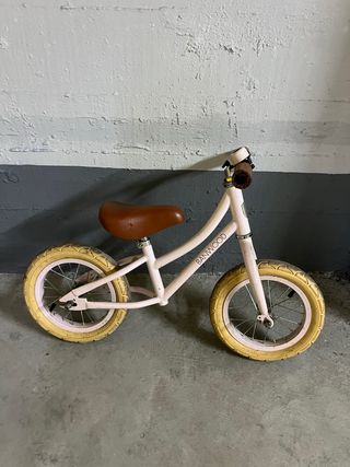 Bicicleta de aprendizaje Banwood en color rosa. Ideal para los primeros paseos. Marco de acero con acabado color Forest Altura mínima del asiento 37cm Altura máxima del asiento 44cm Altura del manillar: ajustable de 50 a 59 cm Cesta de mimbre Timbre incluido Puños de polipiel Sillín: PVC + Polipiel Neumático y cámara: caucho Ruedas color crema de 12"