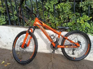 Bicicleta de montaña Megamo para niños o niñas, con un llamativo color naranja y detalles deportivos. - Ruedas de 24 pulgadas. - Frenos de disco Shimano delantero y trasero. - Cambio Shimano SLX - Suspensión delantera. - Neumáticos al 90% - Tiene alguna marca de uso en montaña. No hay que hacerle ningún arreglo, en perfectas condiciones mecánicas. Más información preguntar sin compromiso. REGALO: 1 cubierta y 3 cámaras