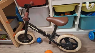 Bicicleta de aprendizaje sin pedales o Bicicleta de equilibrio en muy buen estado,no arañazos, las rayas blancas son reflejos de los focos. conservada en interior. La compramos nueva en Decathlon, un solo propietario - Ruedas de 10 pulgadas.marca btwin Cuadro bajo y reposapiés para que aprenda a su ritmo, ¡pero eso no es todo! Con su freno Stop Easy y sus cojinetes, está preparada para acompañar a tu hijo en sus primeros paseos. Más cositas de niños en mi perfil