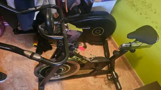 Bicicleta de spinning en color negro, ideal para entrenamientos en casa. - Estructura robusta de acero. - Manillar ajustable. - Sillín acolchado. - Ruedas para facilitar el transporte.