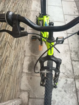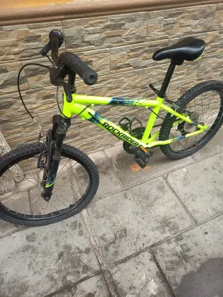 Bicicleta Rockrider de color verde brillante, ideal para aventuras. - Cuadro de aluminio. - Ruedas todoterreno. - Frenos de disco.ultimo precio 80 euros