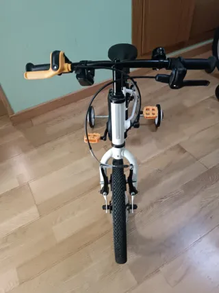 Bicicleta infantil de color blanco y negro, ideal para los más pequeños. Cuenta con pedales naranjas y ruedas de apoyo. - Asiento acolchado. - Manillar con puños negros. - Pedales naranjas. - Ruedas de apoyo.