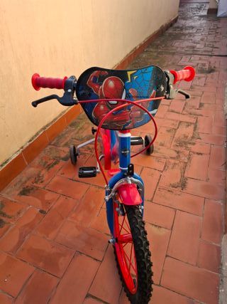 Bicicleta infantil con diseño de Spiderman, ideal para los más pequeños. Cuenta con ruedines para facilitar el aprendizaje. 60 cada una gracias. - Color azul y rojo. - Ruedas de 16 pulgadas. - Freno delantero y trasero. - Sillín ajustable.