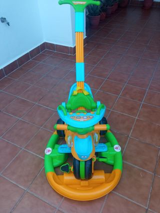 Triciclo infantil con un diseño divertido y colorido, ideal para los más pequeños. - Estructura de plástico resistente. - Mango de empuje para adultos. - Barra de seguridad. - Reposapiés. - Ruedas de goma. - Color naranja, verde y azul.