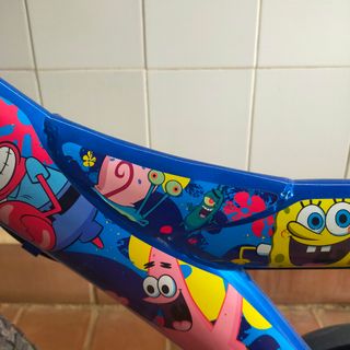 Bicicleta infantil con diseño de Bob Esponja, ideal para los más pequeños. - Ruedas con llantas amarillas. - De 16" - Incluye ruedines. -Usado en 2 o 3 ocasiones.