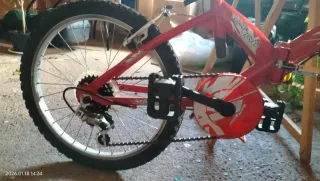 Bicicleta infantil de color rojo, ideal para los más pequeños. Le falta el sillín ,por lo demás está bien - Cuadro de metal resistente. - Ruedas todoterreno. - Amortiguación delantera.