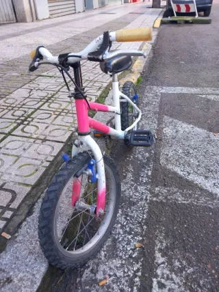 Bicicleta infantil B'twin con ruedas de 16 pulgadas. Diseñada para los más pequeños. - Ruedas de 16 pulgadas. - Guardabarros delanteros y traseros. - Cesta delantera. - Asiento trasero para muñecos, aunque en las fitid está desmontado. - Usada pero en buen estado.
