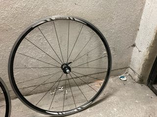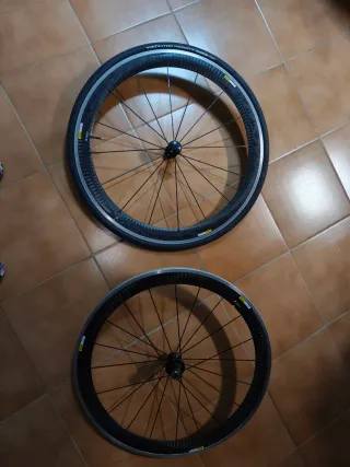 Juego de ruedas Mavic con perfil de carbono. Sólo vendo las llantas sin cubiertas. Zapatas. - Llantas de carbono. - Frenada puentes. - Llanta trasera con raja en cabeza de un radio. Para repuestos. - Rueda delantera en perfecto estado. Se envían a cargo del comprador pero fuera de la aplicación, wallapop no deja por volumen.