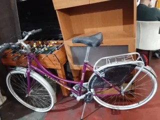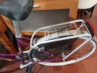 Bicicleta de paseo en color morado, ideal para desplazamientos urbanos. - Cuadro de bicicleta de paseo. - Ruedas de 26 pulgadas. - Incluye cesta delantera y portabultos trasero.