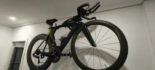 Bicicleta de triatlón de carbono en color negro. Diseñada para un rendimiento aerodinámico. - Cuadro de carbono talla xs - Ruedas de perfil 50 delante 80 detrás Hed - Manillar de triatlón. - Grupo di2 ultegra -potenciometro stages Si quieres más fotos te las paso por WhatsApp Algo negociable