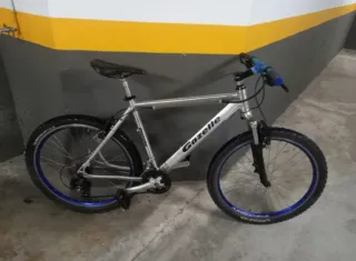 Bicicleta de montaña Boomerang. - Cuadro de aluminio plateado. - Horquilla delantera azul. - Ruedas de 26 pulgadas. - Sillín negro ajustable. Los frenos se los puse nuevos