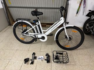 Bicicleta eléctrica Hitway modelo BK8S en color blanco. Ideal para desplazamientos urbanos y paseos. - Bateria 36V,8,4Ah, 300Wh. - 3 Niveles de ayuda al pedaleo. - Diseño moderno y funcional. - Ruedas de buen tamaño para mayor estabilidad 26". - Incluye portabultos trasero. - Cesta delantera para llevar objetos.