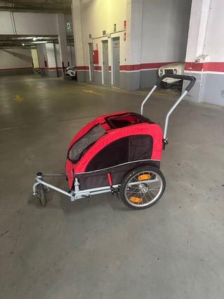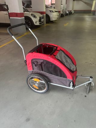 Remolque para bicicleta, ideal para transportar a tu perro o mascota. - Color rojo y gris. - Ruedas de aire. - Ventana superior. - Asa para empujar como carrito.