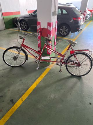 Bicicleta tándem de color rojo, ideal para dos personas. - Diseño clásico. - Ruedas de radios. - Sillines para dos. - Portaequipajes trasero.