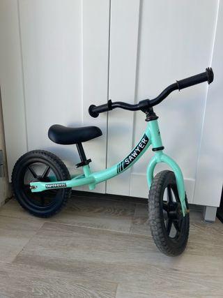 Bicicleta de aprendizaje Sawyer (sin pedales) en color menta, para niños de 2 a 4 años. Altura del sillín ajustable. Ruedas de 12” en muy buen estado. Las gomas de los manillares están bastante rotas. No afecta al funcionamiento de la bici, pero he dejado 2 fotos para que se vea el defecto. Solo venta en persona, no hago envío.