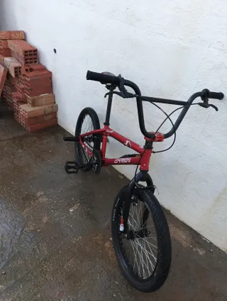 Bicicleta BMX de color rojo, lista para rodar. - Cuadro de BMX. - Ruedas de 20 pulgadas. - Frenos. - Pedales.