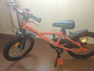Bicicleta infantil B'Twin 500 con diseño de robot. - Ruedas de 16 pulgadas. - Color naranja. - Incluye guardabarros delantero y trasero. - Cadena protegida.