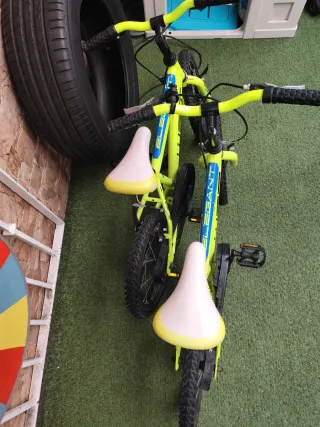 Se vende 2 Bicicletas infantil de color verde brillante, ideal para los más pequeños. - Ruedas de 16 pulgadas. - Sillín blanco y amarillo. - Diseño deportivo con detalles en azul. - Con algunos signos de desgaste: sillón, puños, pedal y freno. - 30€ cada bicicleta.