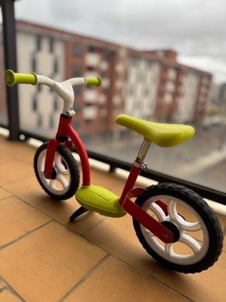 Bicicleta de equilibrio para niños, ideal para aprender a montar. - Marco de color rojo. - Asiento y puños de color verde. - Ruedas blancas con detalles negros.