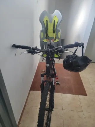 Bicicleta de adulto en buen estado, lista para usar. Incluye una silla infantil para transportar a los más pequeños de forma segura. - Sillín negro. - Ruedas de montaña. - Frenos de disco.