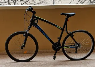 Bicicleta de montaña BTWIN en color negro con detalles en azul y verde. Nueva solo usada dos veces - Cuadro de aluminio. - Ruedas de 26 pulgadas. - Frenos de disco. - Suspensión delantera.