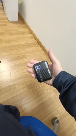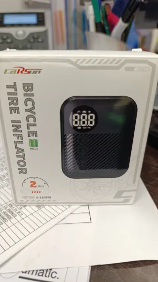 Mini inflador eléctrico portátil para bicicletas. Compacto y fácil de usar. - Capacidad de batería: 480 mAh. - Rango de presión: 0-120 PSI. - Tiempo de inflado: 2 minutos. - Tamaño de neumático compatible: cualquier rueda de bici o motocicleta. (Solo se ha usado para ver si funciona y va perfecto) -En su caja original.