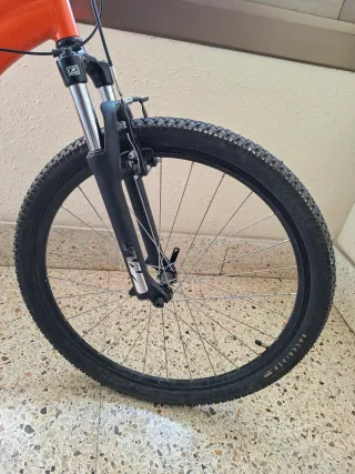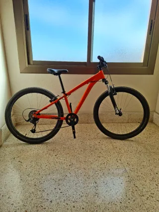 Bicicleta de montaña Rockrider en color naranja. Se encuentra en perfecto estado. - Cuadro de aluminio. - Ruedas de 27.5 pulgadas. - Frenos manuales. - Suspensión delantera. -Sistema de marchas mecánicas. -Puños muy cómodos. -Cadena impecable.