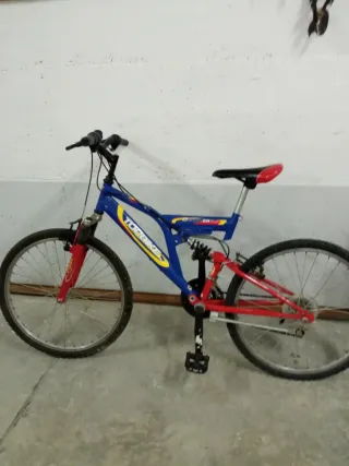 Bicicleta de montaña con ruedas de 24 pulgadas y doble suspensión. - Cuadro azul y rojo. - Sillín negro con detalles rojos. - Ruedas de 24 pulgadas.