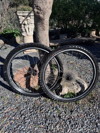 Se vende juego de ruedas de bicicleta de 26 pulgadas.marca bujes gurpil Aros marca rígida aluminio 6061 - Ruedas de aluminio. - Incluye piñonera.cassete 7 velocidades Neumáticos muy buen estado 26 x1.4 Listas para usar las dos por 40