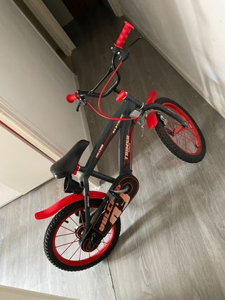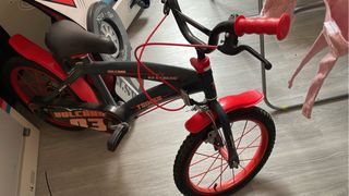 Bicicleta infantil de 16 pulgadas, ideal para los más pequeños. Diseño deportivo en color negro y rojo. - Ruedas de 16 pulgadas. - Frenos delanteros y traseros. - Guardabarros delantero y trasero. - Puños rojos. - Cadena protegida.