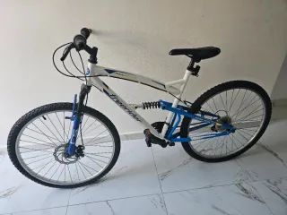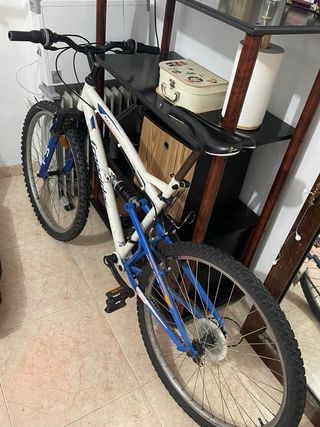 Bicicleta de montaña con suspensión delantera y trasera. - Ruedas de 26 pulgadas. - Cuadro blanco y azul. - Frenos de disco.