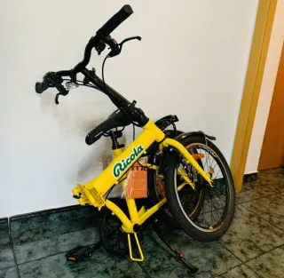 Bicicleta plegable de color amarillo con logo de Ricola. Ideal para desplazamientos urbanos o para llevarla contigo. - Ruedas de 20 pulgadas. - Frenos de mano. - Pata de cabra. - Guardabarros.