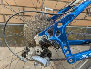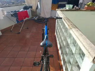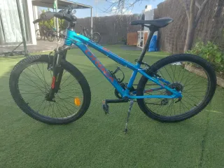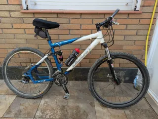 Bicicleta de montaña de color azul, ideal para disfrutar de rutas. Está en muy buen estado, las ruedas las he podido hinchar correctamente, tiene cambio de marchas Shimano, en muy buen estado y suspensión doble. Hay que acabar de ponerla a punto, apretar y ajustar ciertas partes, etc. La vendo así de barata porque ya no la uso y le falta un pedal, pero es super fácil ponerle uno, por 15 euros más te lo compro y te lo pongo yo si quieres. - Cuadro de aluminio. - Suspensión delantera y trasera. - Ruedas de 26 pulgadas. - Frenos de disco.