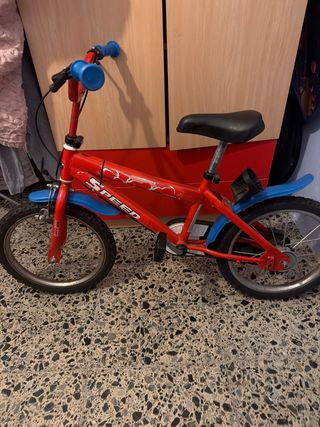 Bicicleta infantil de color rojo con detalles en azul. - Ruedas de 16 pulgadas. - Guardabarros delantero y trasero. - Puños de goma para un mejor agarre.